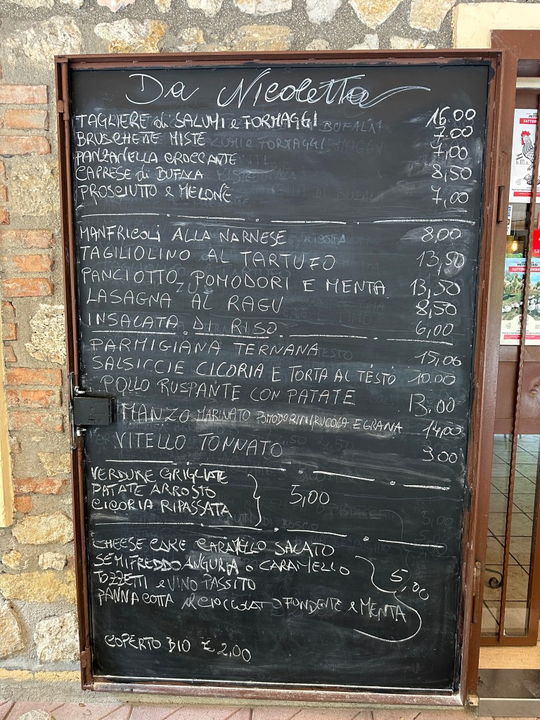 Qui abbiamo mangiato, oltre all’antipasto, i manfricoli alla narnese, piatto tipico della zona che in origine so preparava con acqua di Stifone e farina. Questa tipologia di pasta si trova molto poco al di fuori di Narni e viene spesso servita con il sugo. Un altro piatto che ho amato è il tagliolino al tartufo, veramente buonissimo e con una generosa porzione di vero tartufo grattato sopra.