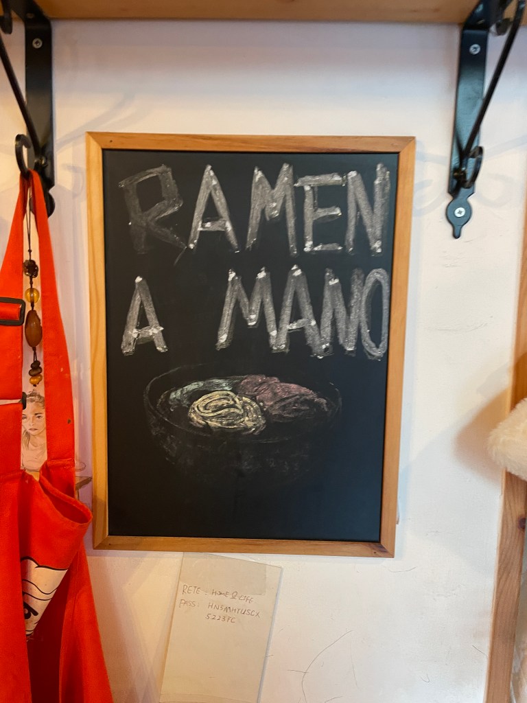 Un piccolo localizzo con tavoli interni e all’aperto che propone un ampio menù di cucina cinese, tra cui Ramen a mano, come indica il cartello.