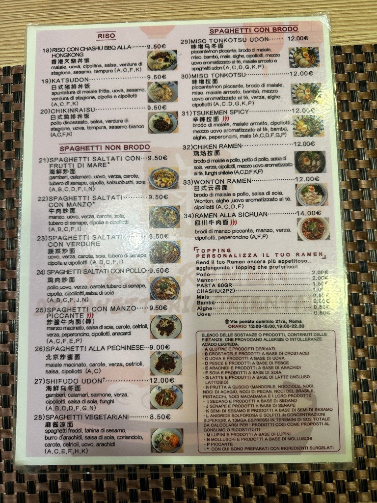Anche in questo posticino servono ramen, nel menù indicati come ‘spaghetti in brodo’, ma anche tanti altri piatti di origine cinese.